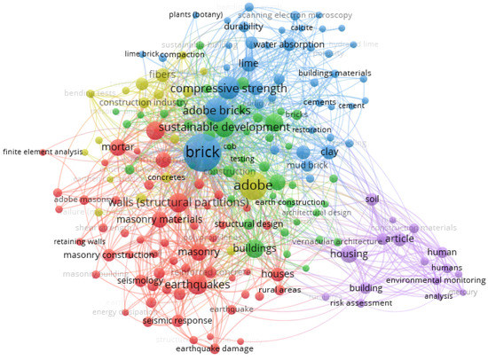Although adobe blocks have disadvantages, it is important to highlight the need for studies with this building material. Performing a bibliometric analysis using the Scopus database starting from the keywords adobe bricks, it is possible to obtain a total of 496 works published in the main journals over 20 years (the results of this analysis are included as Supplementary Materials). Although the database does not present all international journals in building materials, searches with other keywords, such as ceramic bricks, result in 3645 works at the same time. This highlights the urgency of work in the field of adobe blocks. Figure 1 presents the bibliometric study obtained in this project. Interesting words are highlighted, such as compression strength, water absorption, and durability. These analysis techniques were used in this research.