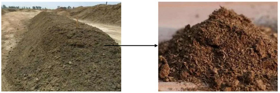 The materials used in the research were: clayey soil from Rio Paranaíba—MG, Brazil; quartz sand to correct the adobe mass; cattle manure as a source of organic matter (Figure 2) to improve the tensile strength properties of adobe and reduce the shrinkage effect; Portland cement and hydrated lime as stabilization to improve compressive strength.