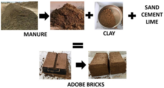 The use of manure must be performed with care, due to the chemical-biological pathological process present in the material. Ren et al. (2021) [11] and Li et al. (2022) [12] points out that manure has a high content of Proteobacteria and Actinobacteria, a pathological condition that can cause diseases in humans if subjected to high content of the material. However, it is observed that the use of low levels of manure, in the order of 10%, is not enough to cause diseases in human beings. This information is proven in other studies [12,13], which used manures for other applications. Another interesting fact is that the use of binders, such as Portland cement and hydrated lime, helps to fix the manure and reduces these health problems. The use of these binders together with manure in adobe blocks is also a research topic in this article.