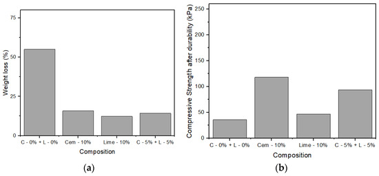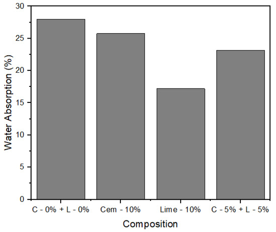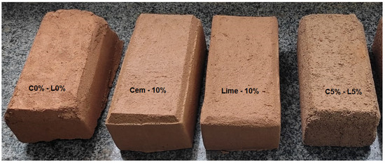 Water absorption (Figure 10) and durability (Figure 11) tests were carried out. Both tests are extremely relevant since the main degradation mechanisms of adobe blocks happen by water attack. The water absorption values reduced with the use of cement and lime. The effect was more intense with the use of lime since the material has high water retention. The values for the composition with 10% of cement were around 25%, which is compared to the values found by Millogo et al. (2008) [38], whose results were between 20–30%; and equivalent to the research by El-Mahallawy et al. (2014) [39], whose water absorption was around 25–28%.