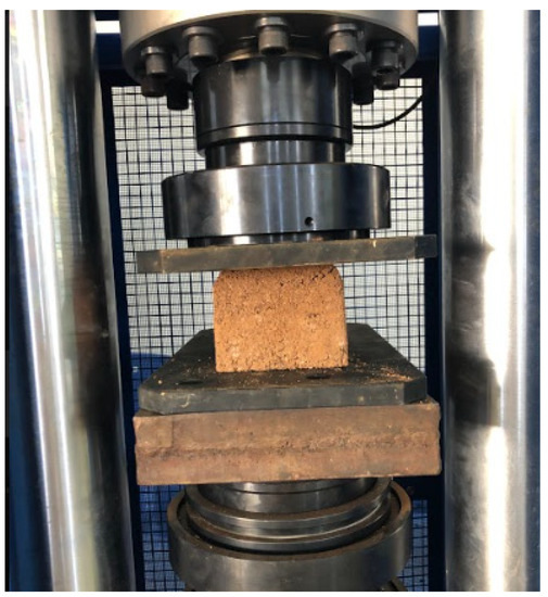 After the drying period, the adobe blocks were tested using the following parameters: axial compressive strength, using a test speed of 0.5 mm/min, an INSTRON universal test press (INSTRON, Norwood, MA, USA; Figure 5); water absorption, using procedures adapted from ASTM C373 (2018) [20], for ceramic materials.