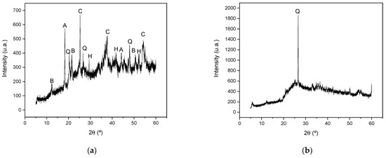 Mineralogical analysis by XRD: (a) clay; (b) manure used in the production of adobe blocks. Caption: A = anatase; B = brookite; C = kaolinite; H = hematite; Q = quartz.