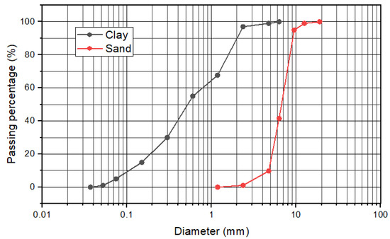 Figure 7 shows the granulometry of the clay and sand used in this research. The sand must be used in adobe blocks as a corrector for the granulometry of the clay used. It is noteworthy that the sand used in the research is a material typically used as an aggregate in construction materials, with a DMC of 2.36 mm and a fineness modulus of 2.97. The amount of sand added must be sufficient to adjust the ideal particle size fractions. As highlighted by Gandia et al. (2019) [18], the ideal material to be used as adobe should have a clay + silt fraction of approximately between 35 and 45%, and a sand fraction between 50 and 60%. The clay used to produce the adobe blocks has a sand fraction of approximately 32%, according to the granulometric curve. This information leads to the need to use 530 g of sand for every 1000 g of clay. Making the calculations proportionally, the total material amount would be 1530 g, of which the sand fraction represents: 530 g + 0.32 × 1000 g = 850 g. This would represent a total of approximately 55.5% of sand fraction, following the recommendation of the authors of the area. By way of comparison, in the work by Gandia et al. (2019) [18], the authors used 600 g of sand for every 1000 g of clay. It is worth noting that these calculations are only approximate, as there is an experimental error in the percentage of sand in clay. The most accurate method would be to determine through particle discrete element method (PDEM), as established by Sun and Huang (2022) [30]. However, the calculations used are an estimate to verify whether the selected raw materials are suitable to produce adobe blocks.