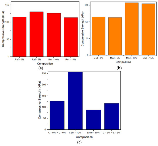Compressive strength results: (a) adobe blocks with clay and manure (Ref-0%, 5%, 10% and 15%); (b) blocks containing sand (Mod-0%, 5%, 10% and 15%); (c) blocks containing cement and lime (C-0% + L-0%, Cem-10%, Lime-10%, and C-5% + L-5%).
