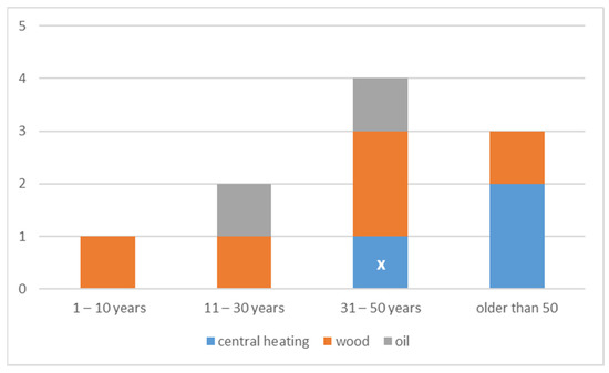 In the area of heating, three schools are connected to the central district heating network. Among the remaining seven schools, the main heat source is wood for five of the schools, while only two schools are heated with oil (Figure 1).