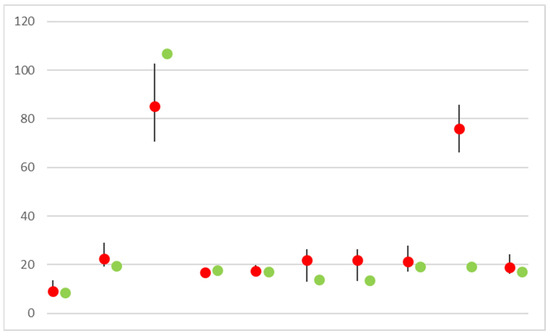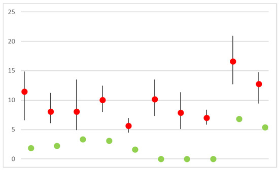 Benzene concentrations (in µg/m3) in the classrooms (minimum—arithmetic mean—maximum, in red) and in front of the school (one sampling point per school, in green).