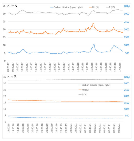 Time course of CO2, temperature, and relative humidity. Scale for temperature (in °C) and for relative humidity (in %) is on the left, for CO2 (in ppm) on the right axis. (A): example from a school on a week-day from 10 a.m. until 6 p.m. (B): example from another school at night from 7 p.m. till 3 a.m.