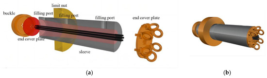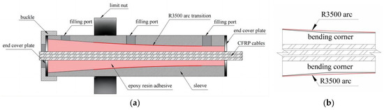 The anchorage system used in this research is a new inner cone + arc + straight cylinder bond-type anchorage. The new anchorage comprises a sleeve, limit nut, end cover, and buckle, as shown in Figure 1. The end cover has corresponding positioning holes to make CFRP cables pass through and keep parallel. As shown in Figure 2a, the end cover is fastened to the sleeve by six bolts with rings at the ends to allow for movement during assembly. The limit nut is used to secure the specimen to the loading table, making jacking and loading easier. The innovation of the new anchorage is to connect the inner cone section and the straight cylinder with an arc section, of which the radius of the curvature is 3500 mm. Instead of bending the corners, curved tapering can be used to eliminate stress peaks in the inner cone–straight transition section, as shown in Figure 1b. Meanwhile, grooves were excavated at the epoxy resin–sleeve interface to increase the roughness and improve the anchoring efficiency. The angle of the inner cone section of the anchorage is 4°, and the length of the straight section accounts for 1/3. CFRP cables have a centrally symmetrical, 3 mm wide hexagonal distribution. In this test, epoxy resin was infiltrated horizontally. As the perfusion inlet, three holes were machined on the lateral side of the sleeve. Figure 2 depicts the 3D perspective view of the anchorage.