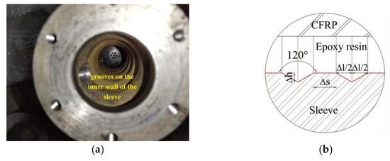 Twelve anchorage systems were utilized in the static load tensile test, separated into six groups. Each set includes 2 steel sleeves, 7 CFRP cables, epoxy resin adhesives, and additional components such as a strain gauge and positioning board. Related parameters are shown in Table 2. The specimens are numbered D-S. D represents the depth of the groove. S represents the spacing of the groove. D0S0 indicates that no treatment is given to the sleeve. The groove angle is 120°, and the breadth is determined by the depth and spacing. As shown in the Figure 3, the width is equal to (h). The CFRP cable used in the test is 4.3 m long and has a diameter of 5 mm.