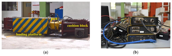 Loading device of static tensile test: (a) loading platform, jack; (b) strain test acquisition system.