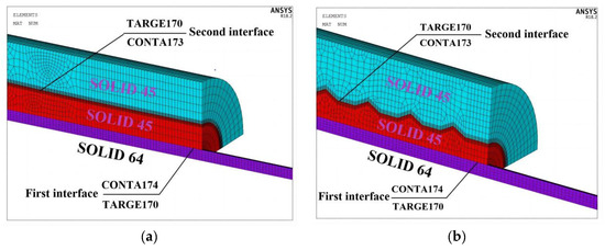 Using ANSYS version 18.2 mechanical software, an FE model was developed to simulate the effect of anchorage design on anchoring efficiency and stress distribution. SOLID45 elements simulated the sleeve and epoxy resin glue, while SOLID64 elements simulated the CFRP cables. Table 1 displays the specific material properties. The first interface contact behavior is set to BONDED. CONTA174l elements were selected to simulate the inner surface of the medium, and TARGE170 elements were selected to simulate the outer surface of the CFRP cables. The second interface contact behavior is set to STANDARD. CONTA173 elements were selected to simulate the outer surface of the medium, and TARGE170 elements were selected to simulate the inner surface of the sleeve. To ensure that the calculation result converged, the normal contact stiffness factor (FKN) was set to 1.0 and the intrusion tolerance coefficient (FTOLN) to 0.1. In this investigation, the extended Lagrangian algorithm was applied. A 1/4 symmetrical model was employed to simplify the model, as illustrated in Figure 6. The FE model was utilized to examine the contact stress and friction at the first and second interfaces, which were difficult to quantify in the tensile test.