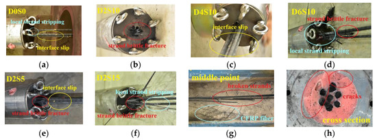 Typical failure mode of specimen: (a) D0S0-anchorage zone; (b) D2S10-anchorage zone; (c) D4S10-anchorage zone; (d) D6S10-anchorage zone; (e) D2S5-anchorage zone; (f) D2S15-anchorage zone; (g) middle point of the free section; (h) cross-section of anchorage zone.