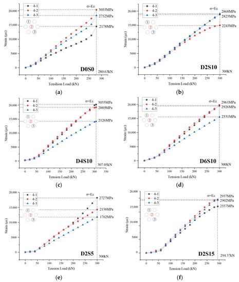 Since the anchorage systems were mainly subjected to axial force, the force of each cable should be close to the same. However, the test results in Figure 8 reflect that the stress between cables is uneven. Three reasons may explain why the uneven forces occurred. Firstly, the length of the free section of CFRP cables is inconsistent due to installation error, which impacts the strain gauge data at the free section’s midpoint. Secondly, as the load increases, the cable and the epoxy resin deformation are not coordinated, resulting in inconsistent readings from the strain gauge, as Bo Feng [13] has noted. Thirdly, due to gravity and colloid extrusion, the cable within the anchoring deviated from the center line during tensioning, resulting in abnormal stress.
