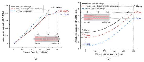 The mechanical performance comparison between the new anchorage and two traditional anchorages was conducted under 2200 MPa through the finite element method. Figure 9a shows that the peak radial compressive stress of the conventional anchorage appears at the loading end. In contrast, the peak radial compressive stress of the new anchorage appears in the anchorage area, with a value of 89.2% of the inner cone anchorage’s peak and 38.8% of the inner cone + straight cylinder anchorage’s peak. Figure 9b illustrates the epoxy–sleeve extrusion stress; the peak value of the new anchor is only 28.98% of that of the inner cone anchor. Figure 9c demonstrates that the axial tensile stresses in the CFRP cables of all three anchoring systems increase from the free end to the loaded end and that the peak stresses at the loaded end are almost identical. Figure 9d depicts the cable’s axial displacement. The axial displacement of the new anchor cable at the loading end is only 75.9% of the inner cone anchorage cable and 87.2% of the inner cone + straight cylinder anchorage cable.