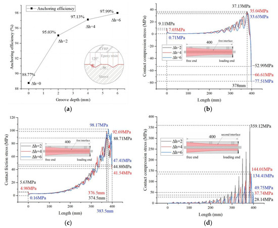 Effect of groove depth on mechanical properties: (a) tensile test—anchoring efficiency; (b) FE analysis—contact compression stress of the first interface (CFRP–epoxy resin); (c) FE analysis—contact friction stress of the first interface (CFRP–epoxy resin); (d) FE analysis—contact compression stress of the second interface (epoxy resin–sleeve).