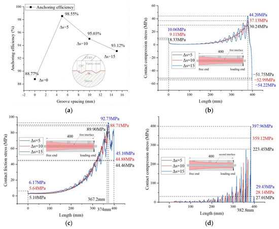 Effect of groove spacing on mechanical properties: (a) tensile test—anchoring efficiency; (b) FE analysis—contact compression stress of the first interface (CFRP–epoxy resin); (c) FE analysis—contact friction stress of the first interface (CFRP–epoxy resin); (d) FE analysis—contact compression stress of the second interface (epoxy resin–sleeve).
