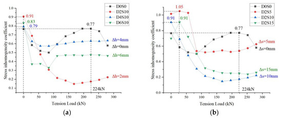 From the load–strain curves of the specimen in Figure 8, it can be seen that the stress of the multi-tendon anchorage system shows obvious inhomogeneity. To study the varying regularity of the stress inhomogeneity with the test parameters, the coefficient is calculated as Equation (2).