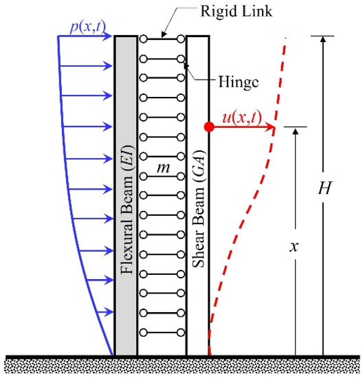 where u(x, t) denotes the lateral displacement at height x above the ground and time t, m indicates the mass per unit height of the building, EI represents the effective flexural rigidity of the flexural beam, and GA indicates the effective shear rigidity of the shear beam. This equation applies for 0 < x < H, where H denotes the total height of the building. The lateral-distributed force p(x, t) can be a wind-induced force, inertia force induced by earthquake shaking, or any other lateral loads.