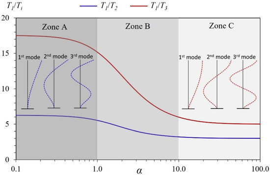 Furthermore, the ith period ratio, defined as the ratio of the first-mode natural period () to the ith mode natural period (), also relies on α.