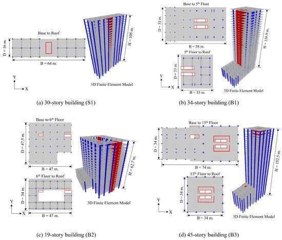 The four high-rise buildings chosen for the case study had heights ranging from 19 to 45 stories and were located in Bangkok, Thailand. They were used as reference cases to verify the accuracy of CSFCBM in estimating the building modal properties and evaluating the building seismic responses. These buildings were named S1, B1, B2, and B3, and their typical floor plans and 3D views are depicted in Figure 3. In every building, the gravity-load-carrying and lateral-load-resisting components were RC slab-column frames (gray and blue regions) and RC walls or cores (red regions), respectively. Masonry infill walls (black dashed lines) were broadly used as exterior and interior partition walls. In all cases, the foundation structure was a mat foundation lying on piles. Buildings B1, B2, and B3 had podiums, and B1 had an unsymmetrical arrangement of RC walls in its tower floor plan; these are vertical and plan irregularities commonly found in high-rise buildings. Conversely, building S1 was a regular building with a symmetrical arrangement of RC walls and uniform structural properties along its height from the base to the top. Table 1 lists the key properties and characteristics of these buildings.