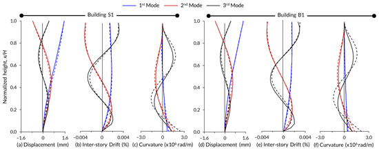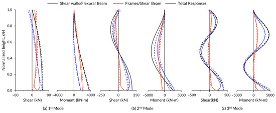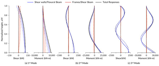 Based on CSFCBM, various responses of each individual vibration mode can be easily estimated using the closed-form formulas. As all types of responses of the ith mode in the linear elastic range are proportional to the modal coordinate , their response values for of 0.001 m (1 mm) were evaluated. The lateral displacement of the ith mode was determined by , where = 0.001 m. The corresponding interstory drift ratio was obtained by considering the partial derivative of the displacement with respect to height x (), and the corresponding deformation curvature was determined using Equation (21). The deformation responses in the x direction of the first, second, and third modes are represented by the blue, red, and black dashed lines in Figure 4, respectively. The corresponding shear forces in the flexural and shear beams, namely, and , were determined using Equations (17) and (18) and are represented by the blue and red dashed lines, respectively, in Figure 5 and Figure 6. The sum of these shear forces is the story shear, , which is represented by the black dashed line. Similarly, the overturning moments in the flexural and shear beams, and , were determined using Equations (19) and (20) and are represented by the blue and red dashed lines, respectively, in Figure 5 and Figure 6. The sum of these moments is the story overturning moment and is represented by the black dashed line.