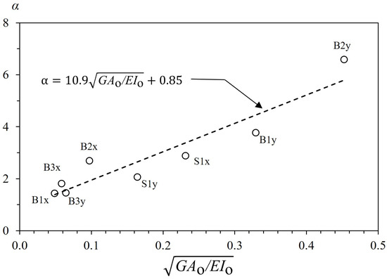 Table 4 summarizes the structural indexes and in the x and y directions obtained using the as-built drawings of the four case study buildings. Additionally, the α value of each building in each direction (x, y) is indicated. In all cases, the typical floor plan properties for the floors just above the podium level were used for this calculation. The relationship between α and the structural index can be determined using these data.