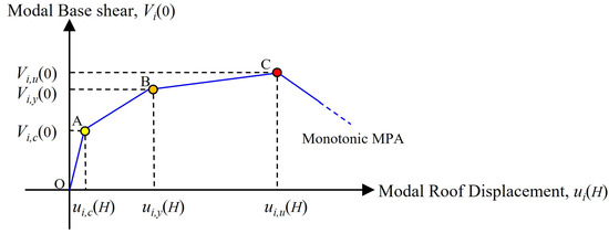 A cyclic MPA is a direct technique to identify this complex modal hysteretic response of a building. This analysis is typically performed for each and every important vibration mode. For the ith mode, the analysis is accomplished by first applying gravity loads, then applying lateral forces with the ith modal inertia force pattern over the height of the building. The gravity loads are kept constant, whereas the magnitude of these lateral forces is gradually increased and reversed to produce cyclic responses with steadily increasing amplitude. Under this force pattern, the lateral displacements and other responses are anticipated to be dominated by those of the ith mode. Having these responses, one can construct the cyclic relationship between the modal base shear, , and modal roof displacement, . This relationship can be transformed into the relationship by assuming the deform shape at any point during the cyclic MPA corresponds to a natural vibration mode shape. Based on this assumption, the relationship between and can be determined using