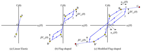 After the coordinates at points A and B in each vibration mode are determined by the procedures explained above, the next (and final) step is to estimate the β value, which is considered to be strongly associated with dimensionless structural index P/Ps of the primary wall. To determine the relationship between and , cyclic MPAs were performed for the first three modes of all four case study buildings. The maximum roof displacements of these MPAs were set between points A and B to obtain the clearest flag-shaped relationship between Vi(0) and ui(H). Subsequently, a flag-shaped hysteretic model with a certain value was mapped to the result. The mapping process was repeated iteratively with different coordinates of points A and B and different values by trial and error until the hysteretic model best fit the result, particularly the area enclosed by the hysteretic loop (flag area).