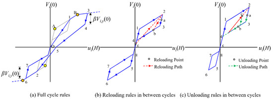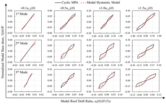 Second, the modal hysteretic models generated from the coordinates (point A and B) and values estimated using the proposed procedure are verified by comparing them with those determined directly from the cyclic MPA. In these models, the hysteretic rules and residual deformation relationship developed by Pandey [39] are followed, and the post-yield stiffness is assumed to be 0.2 times its post-crack stiffness for estimating the response beyond point B. The comparison is presented as cycle-by-cycle plots of the modal hysteretic responses of building B2 on the x axis, as depicted in Figure 14. Four levels of displacement amplitude were selected for this comparison, namely, low (0.1ui,y(H)), middle (0.5ui,y(H)), yield (1.0ui,y(H)), and post-yield (1.5ui,y(H)). The results verify that the estimated modal hysteretic models concur reasonably well with those obtained from the cyclic MPA in all displacement ranges. Similar verification was also conducted for three other case study buildings in both directions, and similar good results were obtained, confirming the applicability of the proposed procedure. More details on the verification of the developed modal hysteretic model can be found in Suwansaya [37].