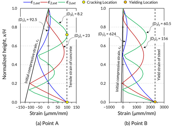 where denotes the distance measured from the neutral axis of the cross-section of the wall to the extreme tension face (fiber) of the wall. Note that if the distance from the neutral axis to the extreme compression face of the wall () is substituted with in Equation (22), the corresponding flexural strain at the extreme compression face can also be computed.