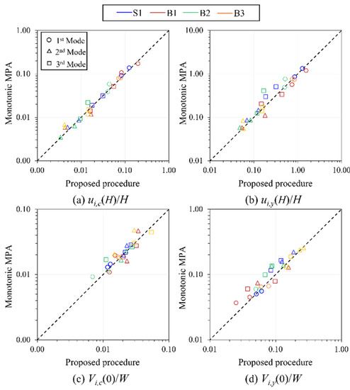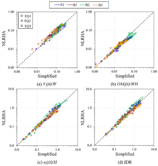 Subsequently, the influence of the building configurations, characteristics of ground motion, and intensity level on the accuracy of the simplified procedure are examined. For this purpose, the selected ground motions (EQ1, EQ2, and EQ3) were scaled to eight levels ranging from 0.2 to 1.6 and applied to entire case study buildings using both NLRHA and the proposed procedure. Owing to numerous output seismic demands (96 cases), the maximum normalized base shear (Vi(0)/W), normalized base overturning moment (OMi(0)/WH), roof drift ratio (ui(H)/H), and interstory drift ratio () are primarily considered in this comparison.