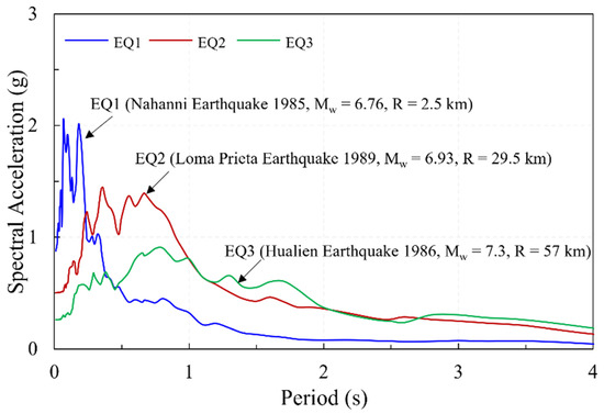 In this section, the validity and accuracy of the proposed simplified procedure based on UMRHA and CSFCBM are carefully checked. Various seismic demands of the four case study buildings under different ground motions were computed using the proposed simplified procedure, and these demands were compared with those computed by NLRHA using 3D nonlinear FEMs. Three pairs of horizontal ground motions, namely, EQ1, EQ2, and EQ3, were selected from the Pacific Earthquake Engineering Research Center (PEER) strong ground motion database for the comparison [41]. These motions were recorded on site class D, with VS30 between 180 and 360 m/s, during three different shallow crustal earthquake events with moment magnitudes between 6.8 and 7.3 and source-to-site distances between 2.5 km and 57 km. Figure 15 illustrates the geometric mean response spectrum with a damping ratio of 2.5% for each and every pair. It can be seen that EQ1 exhibits a relatively short-period motion, EQ3 exhibits a relatively long-period motion, and EQ2 is somewhere in between.