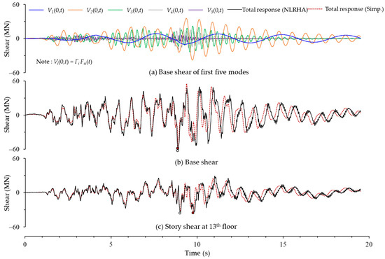 Figure 16 shows examples of the computed seismic responses of building B3 to EQ1. Figure 16a depicts the modal base shear of the first five modes in the x axis computed using the simplified procedure. As can be observed, the modal base shear of the second mode is the highest among those of all participating modes. Their sum, the base shear, as shown in Figure 16b, is also dominated by the contribution from the second mode and is well matched with that computed by the NLRHA procedure. The latter is obtained by adding the shear forces of all RC walls, columns, and masonry infill walls at the base of the building. The base shear demand from the NLRHA procedure, as denoted by the white dot, is extremely close to that of the simplified procedure denoted by the red dot. A similar comparison is also made for the story shear at the 13th floor, which is approximately one-fourth of the building height; the results concurred adequately in this case as well.