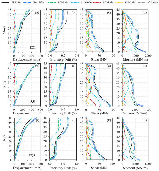 Figure 17 illustrates the comparison of various story-level seismic demands of building B3 subjected to EQ1, EQ2, and EQ3 computed using the two procedures. In all cases, reasonably adequate concurrence was obtained, confirming the reliability and accuracy of the simplified procedure. The figure also includes the contributions to seismic demands from each individual mode computed using the simplified procedure. The contributions from all five modes to the story shear demand are found to be significant, and none of them can be neglected. Conversely, the lateral displacement and interstory drift ratio demands are well dominated by the contributions from the first two modes; the contributions from other higher modes can be ignored. These results provide an improved understanding of the contributions from different vibration modes to various seismic demands.