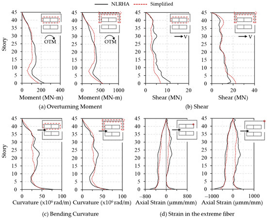 The flexural rigidity of each individual wall () can be determined using the gross properties specified in the as-built drawings. Although each individual wall might crack or yield at any level, resulting in changes in its flexural rigidity, we determined that this ratio computed under gross properties accurately distributes the responses among all RC walls in all case study buildings. The force-related responses of each wall of the ith mode can be combined using Equation (6) to determine the force-related demands. Figure 18a,b show examples of the computed story shear and overturning moment demands of the two RC walls in building B3 when subjected to EQ1. The results indicate that the simplified procedure computes responses that are reasonably close to those computed by the NLRHA procedure.