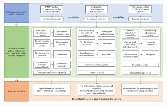 Based on the above analysis, we built the “interest–situation–conflict” model, which was divided into three types of conflict subjects, three types of conflicts, and three conflict scenarios. Among them, the three types of conflict subjects included government, enterprises and residents; the three types of conflicts included the conflict between government and residents, the conflict between government and enterprises, and the conflict between enterprises and residents. Among them, seven types of conflicts were subdivided, including nimby conflicts, compensation conflict, development conflict, goal conflict, financial conflict, participation conflict, and conflict of rights and interests; the three conflict scenarios include policies and systems, supervision and feedback, and different standpoints. Specific analysis is as follows: The different interest groups’ pursuit for interest, including the interest of the government, the developers, the polluting enterprises, and the community residents, is the major cause of the conflicts in the renovation of industrial buildings. As the rational economic men, all interest-related groups will take every measure to maximize their interest and at the same time avoid hurting their own interest.
