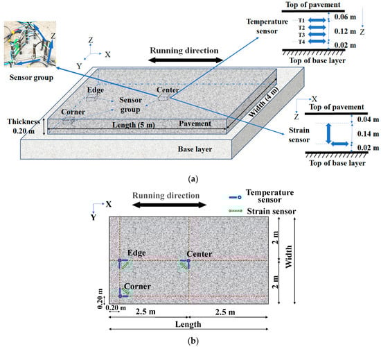 In order to ensure that the sensors were closely mosaic with the surface layer, the sensors were pre-installed before the concrete surface layer was cast. First, the steel bracket was placed on the base layer, according to the positions shown in Figure 1. The sensor was then attached to the bracket, and the surface layer of concrete was finally cast. Manual vibration was used to cast the concrete near the sensor group. The fiber Bragg grating sensors were installed as shown in Figure 2. The fiber Bragg grating groups were placed in the center, edge and corner of the pavement, respectively, and each group contained four temperature sensors and three strain sensors. The center was the diagonal intersection of the rectangular pavement slab, the edge was the midpoint of the wide side of the pavement slab, and the corner was the intersection of the long side and wide side of the pavement slab. The detailed layout directions of the sensors are shown in Figure 2a. The X-axis was the running direction, the Y-axis was the width direction of the pavement and the Z-axis was the thickness direction of the pavement. The fiber Bragg grating temperature sensors were placed evenly along the thickness direction, with a safety distance of 0.06 m and 0.02 m at the top and bottom of the pavement, respectively, to reduce the effect of the concrete casting on the sensor locations. The temperature sensors were located at 0.06 m, 0.10 m, 0.14 m and 0.18 m away from the top of the pavement slab, which were recorded as T1, T2, T3 and T4, respectively. The temperature sensors were used to monitor the temperature distribution at the top (T1), middle (T2), and bottom (T4) of the RCP. The fiber Bragg grating temperature strain sensors were deployed one along the X-axis, Y-axis and Z-axis. Along the X-axis and Y-axis, a horizontal strain sensor was placed at 0.02 m from the top surface of the base layer to obtain the strain of the bottom of pavement, respectively. Along the Z-axis, a vertical strain sensor was placed to obtain the strain of the pavement slab along the thickness direction, with its lower end at 0.02 m from the top surface of the base layer and its upper end at 0.16 m from the top of the base layer. Especially for the fiber Bragg grating strain sensors at the edges and corners of the pavement, as shown in Figure 2b, the end of the horizontally placed strain sensor was 0.20 m from the boundary of the pavement slab to reduce the boundary effects during pavement casting.