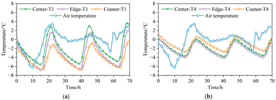 Figure 3 shows the temperature time history curves of the top and bottom of the RCP at different horizontal positions, which characterize the horizontal distribution of the temperature in the RCP. Overall, the temperature change in the plate lagged behind the air temperature, and the lag at the bottom is more obvious. The proportion of temperature–rise time in a temperature cycle was approximately 1/4, which is significantly smaller than the proportion of the temperature–fall time. This is because the decreasing temperature phase is simply the heat exchange between the concrete and the external environment in relation to the external temperature, whereas in the increasing temperature phase, the concrete pavement is affected not only by the external temperature but also by the thermal radiation, which accounts for approximately 50% of the effect.