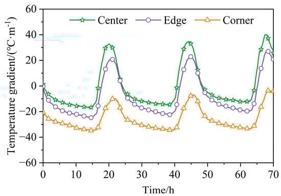 As can be seen from Figure 5, the frequency distribution width of the temperature gradient at the center and edge of the RCP is similar but larger than the frequency distribution width at the corner. The average temperature gradients at the center, edge and corner of the pavement were −0.9, −8.3 and −25.9 °C·m−1, respectively. The percentages of negative temperature gradients in the center, edge and corner of the pavement were 70%, 75% and 100%, respectively. This further indicates that RCPs are mostly subject to negative, temperature-induced curling at the corners in the winter.