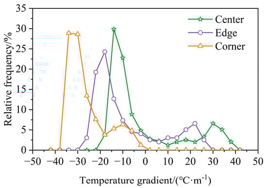 With T1 as the temperature at the top of the pavement and T4 as the temperature at the bottom of the pavement, the temperature gradients at different horizontal positions of the RCP were calculated. The evolution of the results with time is displayed in Figure 4. The whole temperature gradient was then divided into several intervals, and the interval was 4 °C. The frequency statistics of the temperature gradients were then carried out. These results are displayed in Figure 5.