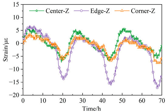 Each sensor group consisted of four temperature sensors and three strain sensors. All sensors were numbered to facilitate data processing and analysis. The number of each strain sensor was the combination of its horizontal position and direction: for example, Center-X, Edge-Y, Corner-Z. The number of each temperature sensor was the combination of its horizontal position and vertical arrangement order, for example Center-T1, Edge-T2, Corner-T4.