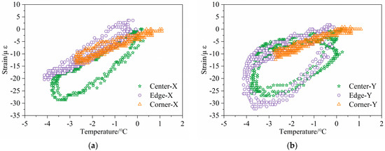 According to the monitoring deployment scheme, the scatter diagram is drawn with the data obtained from the temperature sensor T4 and the X-axis and Y-axis strain sensors of the RCP bottom, and the results are shown in Figure 10. It can be seen that the change of strain with temperature was not linear. The strain paths of daytime heating and nighttime cooling did not coincide, and the temperature–strain curves show a significant hysteresis loop phenomenon. For the temperature–strain effect along the X-axis, the hysteresis loops became progressively smaller from the center to the edge and then to the corner of the pavement. At the corner of the pavement, the hysteresis loops became almost band-like. For the temperature–strain effect along the Y-axis, the hysteresis effect at the center and edge of the pavement was similar and stronger than that at the corner. This indicates that the deformation at the corner of the RCP was only affected by the temperature change, while at the center and edge of the pavement it was affected not only by the temperature change but also by the deformation of the corner, which was transferred to the center and edge of the pavement, resulting in the superposition of the deformation. Comparing the temperature–strain coefficients at the center, edge and corner of the RCP, it is found that the center and edge had the highest temperature sensitivity along the X-axis and therefore demonstrated a more obvious deformation under the same temperature conditions.