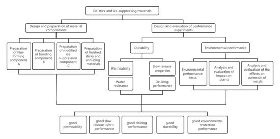 The ice-suppressing material developed in this paper has the characteristics of active deicing, zero negative impact on roads, bridges, and other ancillary facilities and vegetation, preventive maintenance for the pavement, and continuous deicing in winter. In asphalt pavement, the effective components of the anti-freezing agent are slowly released for a long time under the action of the slow-release agent to achieve the effect of long-term snow melting and ice suppression. It has great innovation and application prospects and provides a new method and way for road deicing. The flowchart of the paper is shown in Figure 1.