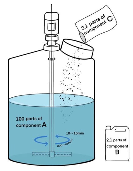 We added 3.1 parts of modified ice suppression component C into 100 parts of film-forming component A, then added 2.1 parts of adhesive component B, stirred them at 200~400 rpm for 10~15 min, and obtained the viscosity-reducing and ice-defending materials after mixing well. The schematic diagram of the finished product of the viscosity-reducing and ice-defending materials is shown in Figure 2.
