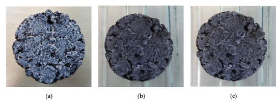The method designed in this paper to evaluate the ice-deicing ability of the freezing point inhibitor of the viscosity-reducing and ice-defending materials through precipitation is as follows: we brushed the mixture of the viscosity-reducing and ice-defending materials to Marshall specimens, after the viscosity-reducing and ice-defending materials were dried, we put the specimens in quantitative water to soak for 3 h, and took soaked water specimens for argentimetry []. Then, we put the water and the specimens together at the temperature of −30 °C, and took out the specimens after 3 h, we also carried out the “falling ball impact test”. If the ice layer was loose and fragile, it indicated that the viscosity-reducing and ice-defending materials had an ice-deicing effect. We removed the ice layer on the surface of the specimens and continued to place the viscosity-reducing and ice-defending materials specimens in the new same amount of water. We took the soaked water specimens for argentimetry, then put them in the water at a temperature of −30 °C again, and so on. The blank specimen was taken as the control group specimen each time. After at least 7 cycle tests (equivalent to the snowfall of 7 snowstorms in a winter) [], if the viscosity-reducing and ice-defending material still has the effect of ice-deicing, it indicated that the viscosity-reducing and ice-defending material has a lasting ice-deicing ability.