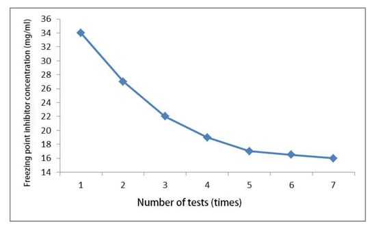 The specimen of the viscosity-reducing and ice-defending materials after 7 cycles of tests and the “falling ball impact test” is shown in Figure 4. The viscosity-reducing and ice-defending materials specimen still had ice-deicing performance after 7 cycles of tests, through the test, it could also be determined that the concentration of freezing point inhibitor in water was reduced from 34 mg/mL to 16 mg/mL after 7 cycles of tests. The test results are shown in Figure 5. The viscosity-reducing and ice-defending materials still had an ice-deicing effect at this time, indicating that the viscosity-reducing and ice-defending materials had a good ice-deicing performance.