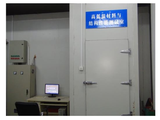 After the debonding and ice suppression material is sprayed on the road surface, it must be subjected to the rolling and abrasion effect of the vehicle for a long time in order to verify the wear condition of the debonding and ice suppression material after being rolled by the vehicle and the effect of the debonding and ice suppression material after being rolled and worn by the vehicle. In this paper, the debonding and ice suppression material was sprayed on the rutting plate specimens and tested in the high and low-temperature material and structural performance test room (as shown in Figure 6). The high- and low-temperature material and structural performance test room are specially designed to verify the pavement material and structural performance designed closed laboratory. The temperature in the test room can be controlled by the program, and the temperature can be controlled at −60 °C–+60 °C. The pavement material and structure tests are carried out on the steel channel test platform (as shown in Figure 7). The width of the steel channel test platform is 1.2 m. The length is 3m, asphalt rutting boards can be used for splicing to simulate asphalt pavement, and a trolley (pressure is 0.7 MPa, speed is 30 m/min) is used to simulate vehicle load. The steel channel test platform can control the thickness of the ice layer by controlling the amount of water added. Asphalt pavement simulation specimens were composed of 40 rutting plate specimens. One part of the rutting plate specimens was sprayed with debonding and ice-suppressing material and cured, and the other part was the blank control group specimen.