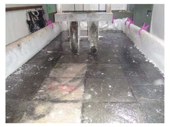 In order to simulate the deicing performance of the debonding and ice-suppressing material specimens, the asphalt pavement simulation specimens were composed of 40 rutting plate specimens on the steel channel test platform. The specimen was under a temperature of −30 °C and the thickness of the ice layer was controlled by different water addition amounts to 4 mm and 10 mm to simulate the actual situation of icing on the southern asphalt pavement and the icing on the northern asphalt pavement. We started the trolley to roll the ice surface of the specimen.