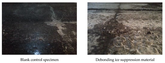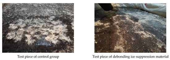 To further verify this conclusion, this paper conducts a simulation test on the deicing effect of the test piece after the trolley is rolled and worn. At −30 °C, an ice layer with a thickness of 4mm is formed on the surface of the test piece by sprinkling water, and then the trolley started to roll. After 400 times of round trip rolling, the wheel track belt on the surface of the test piece sprayed with debonding ice suppression material breaks, and the wheel track belt exposes the surface of the test piece, while the wheel track belt of the blank group test piece has almost no change. As shown in Figure 10, the rolling wear of the trolley has little influence on the deicing effect of the debonding ice suppression material.