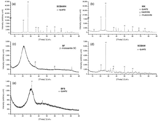 Materials crystal phases and mineralogical composition were analyzed by XRD. The X-ray diffraction was performed with a Shimadzu XRD-7000 diffractometer operating with Cu K-alpha radiation (40 kV/30 mA), with 2θ from 5° to 100° at a step of 2°/min. The peaks were identified using the software Match! 3 (Version 3.7.0.124) with the Crystallography Open Database (COD) revision no. 211633. The XRD patterns of SF, BFS, MK, SCBAM and SCBAMH are shown in Figure 1. BFS (Figure 1e) and SF (Figure 1c) presented a wide hump at around 30° and 23° [69], respectively, which is related to the presence of amorphous phases. In the BFS (Figure 1e), the hump is also attributed to calcium silicate oxide; and it can be attributed to the SiO2/Al2O3 ratio up to 2.2 [70]. This amorphous feature present in BFS and SF is related to the reactivity in those materials. At the same time, the MK spectra (Figure 1b) exhibit intense peaks of quartz (COD 96-101-1160) that imply high silica content [51]. In addition, kaolinite (COD 96-900-9235) and muscovite (COD 96-900-6330) is also observed in MK diffraction. This high content of crystalline phases could indicate a reduction in its reactivity. The diffraction of SCBAM (Figure 1d) exhibits an angle between 10° and 35° (2θ) [41,71]. Those angles are related to silica in three forms: (i) crystalline quartz; (ii) cristobalite; and (iii) amorphous silica [43,72]. On the other hand, the amorphous hump could also be related to the presence of carbon content. The cristobalite phase in SCBAM describes the phase changing of amorphous silica during uncontrolled burning while the quartz phase is associated with the sand attached to the SCBA during harvesting [42,73]. Besides that, the amorphous content of SCBAMH (Figure 1a) decreased [40], while the quartz peak intensity increased with increasing temperature.